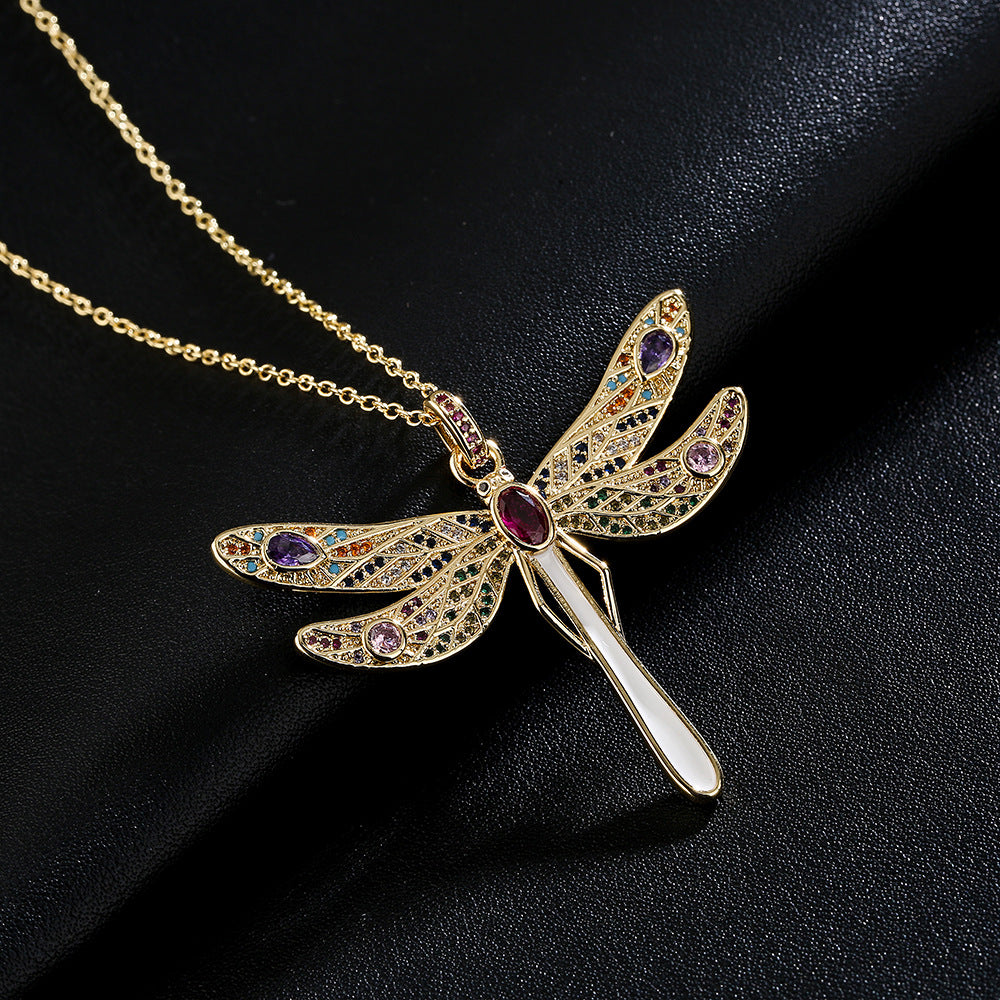 Copper Plated 18K Gold Micro Set Zircon Large Size Dragonfly Pendant Necklace