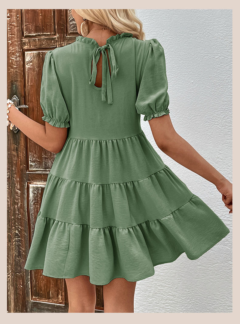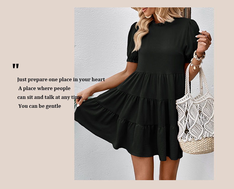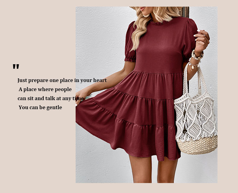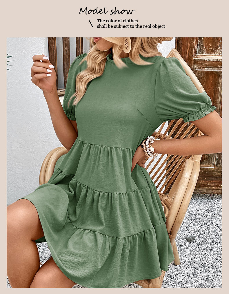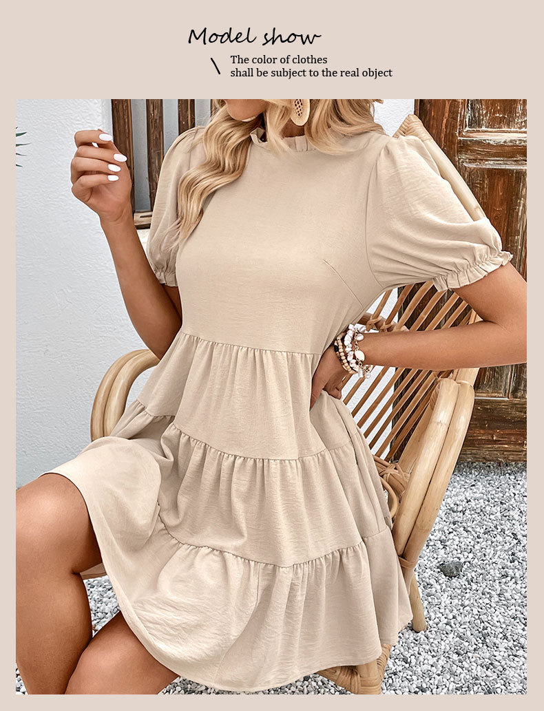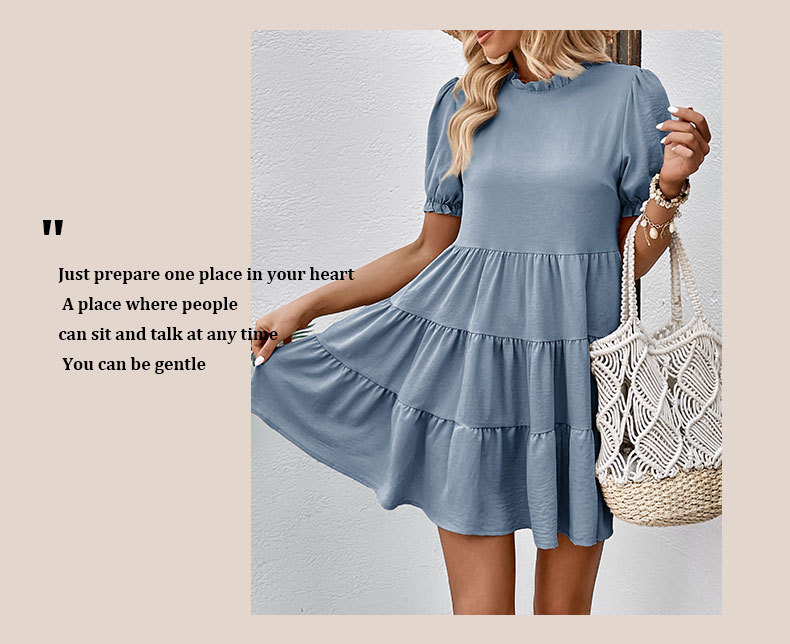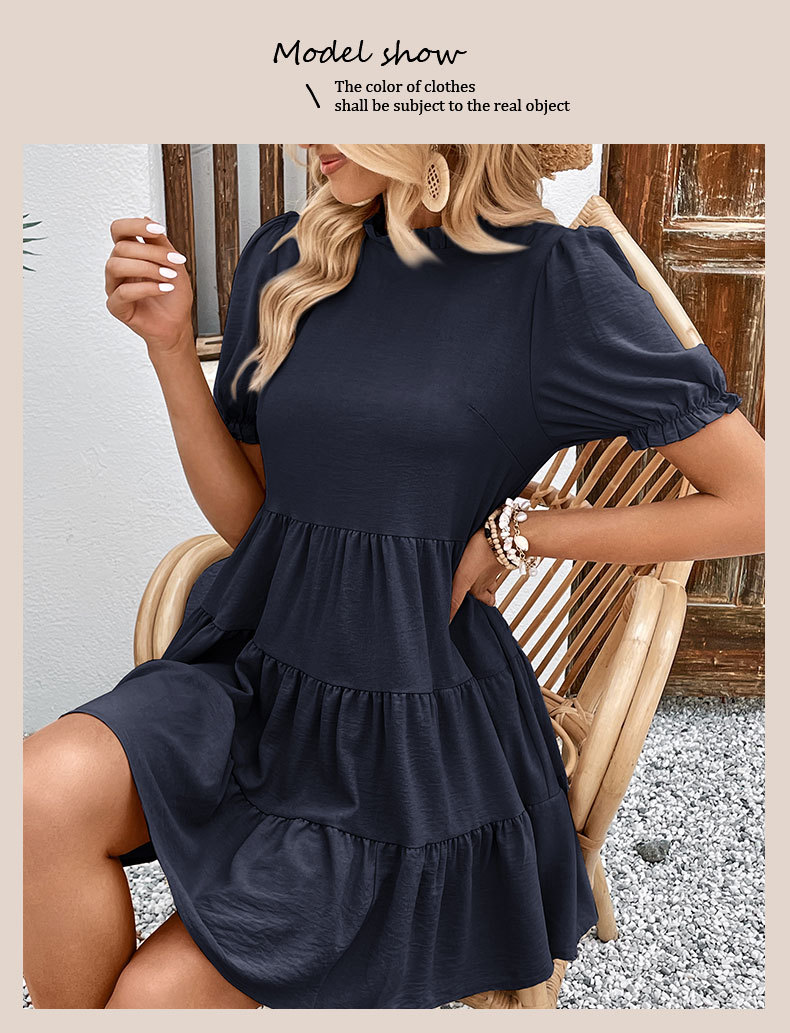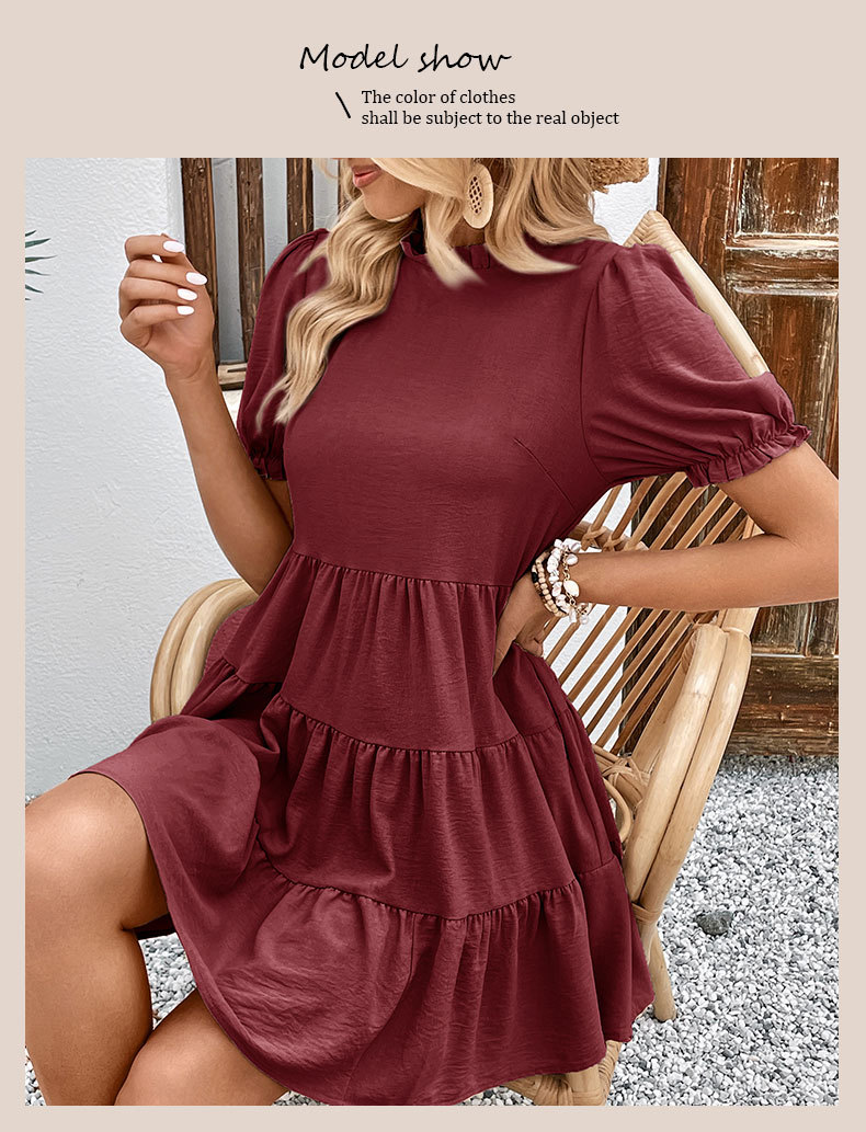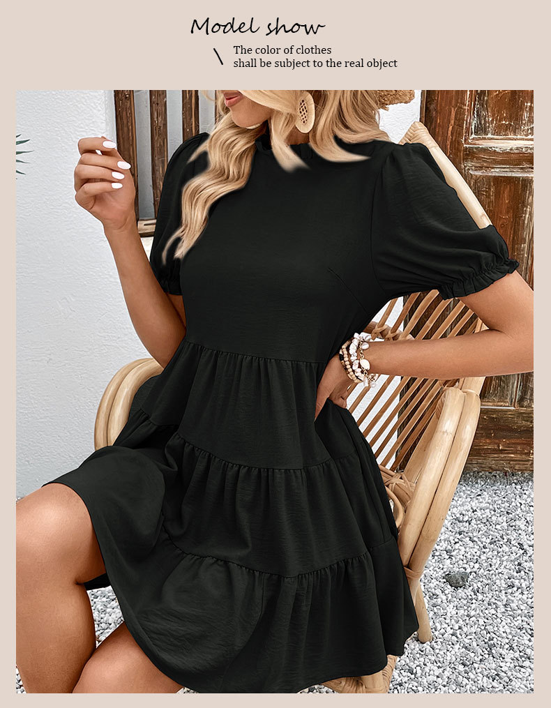 Loose-fitting Round-neck Short-sleeve Pleated Solid-color Dress