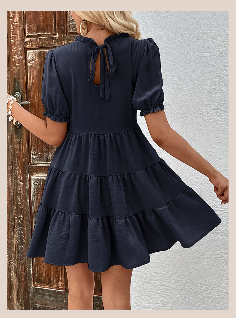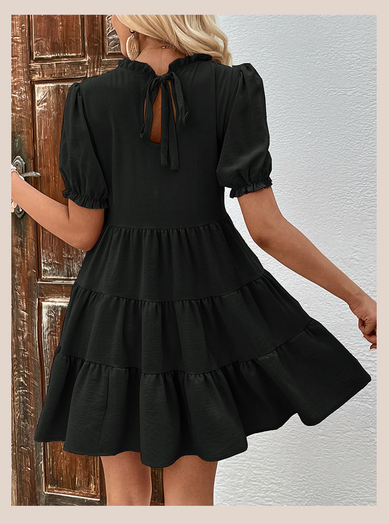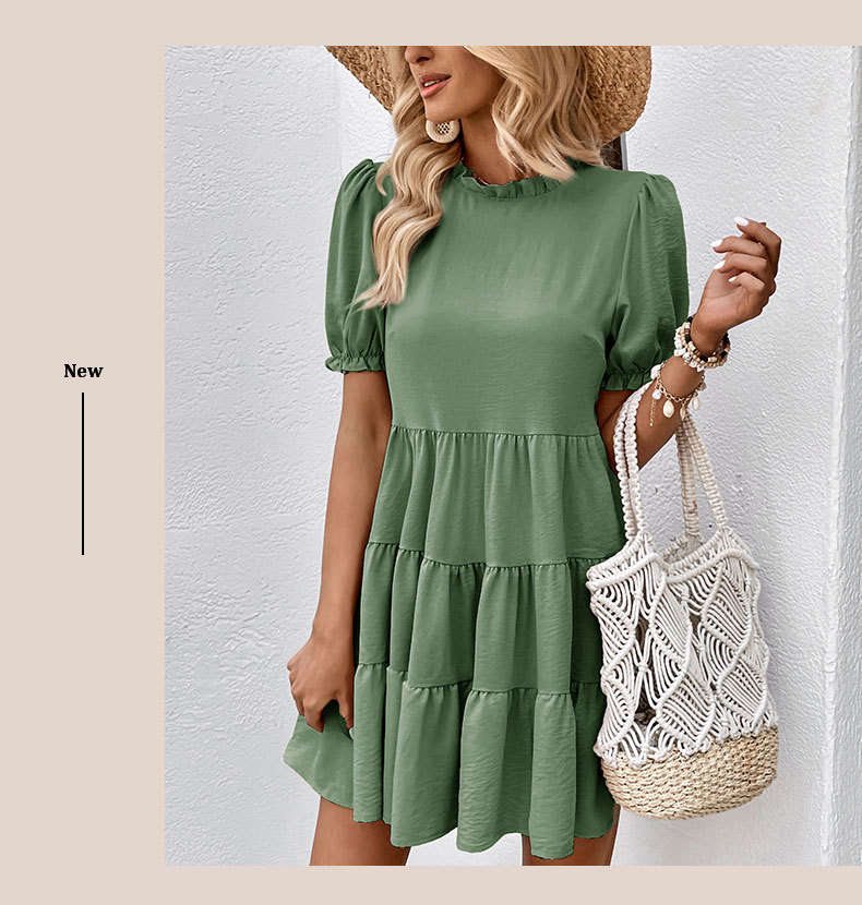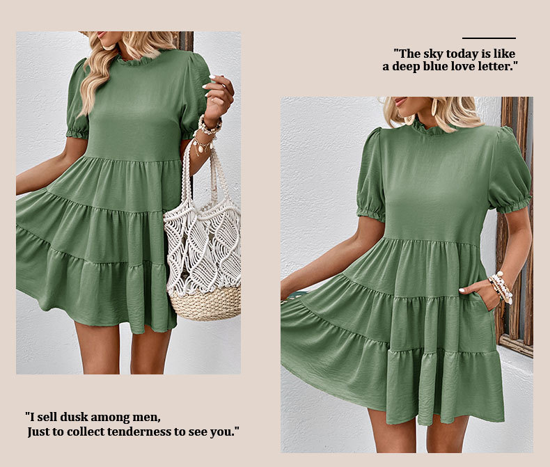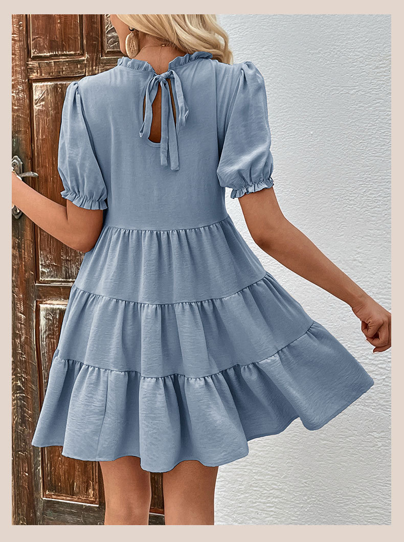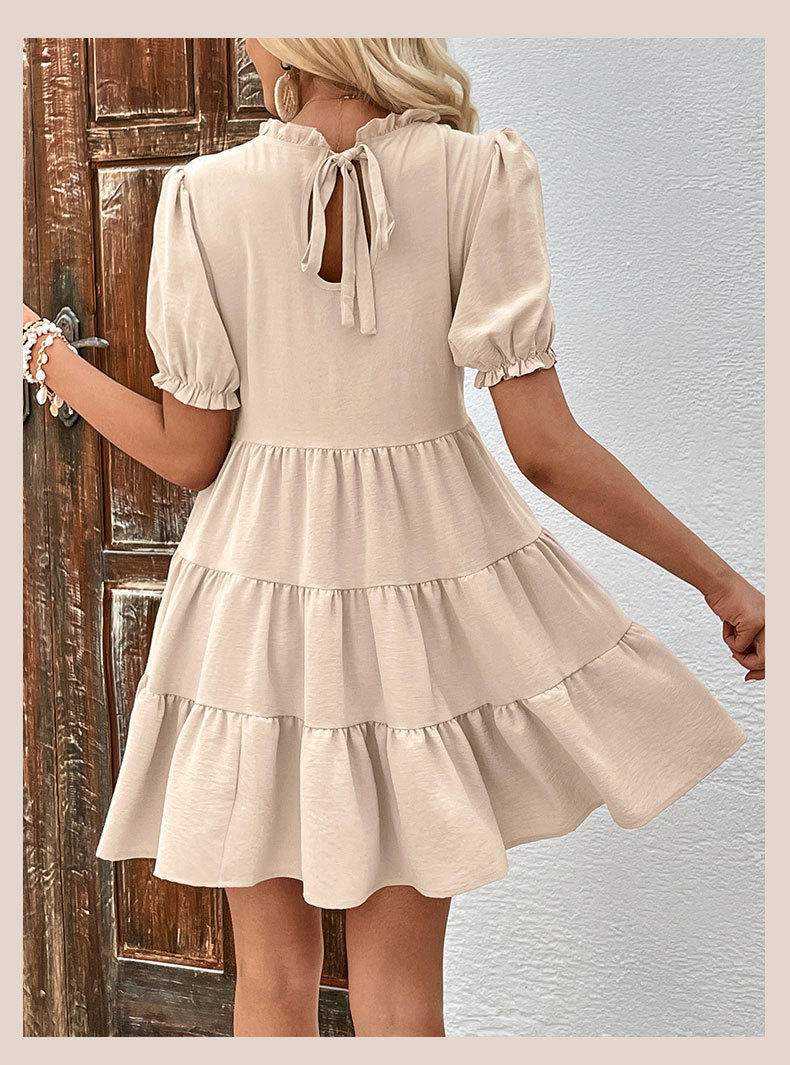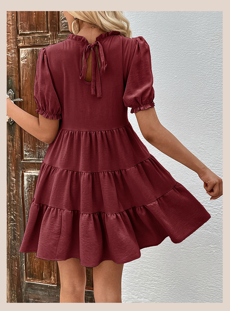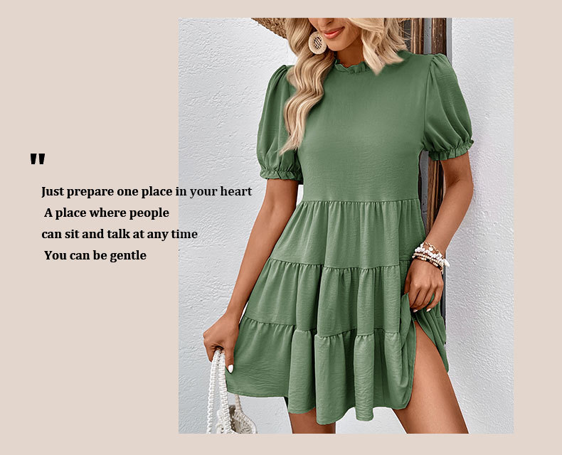 Loose-fitting Round-neck Short-sleeve Pleated Solid-color Dress