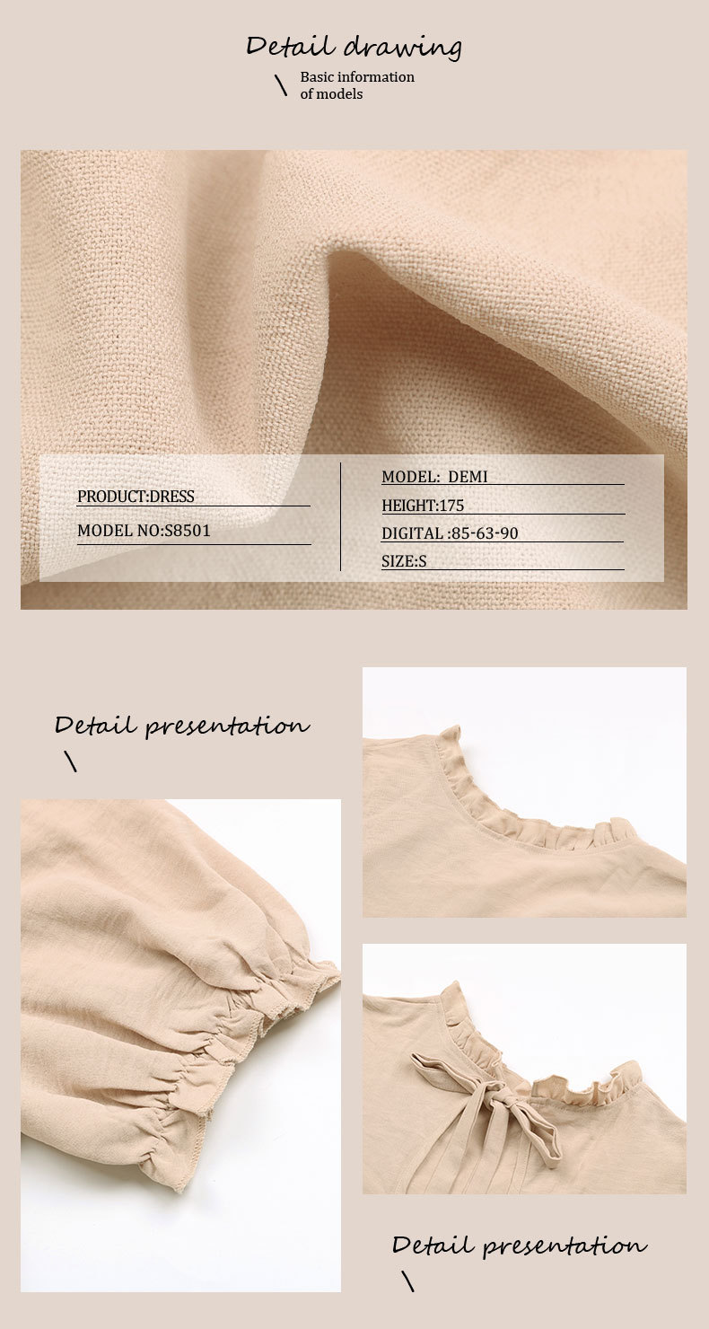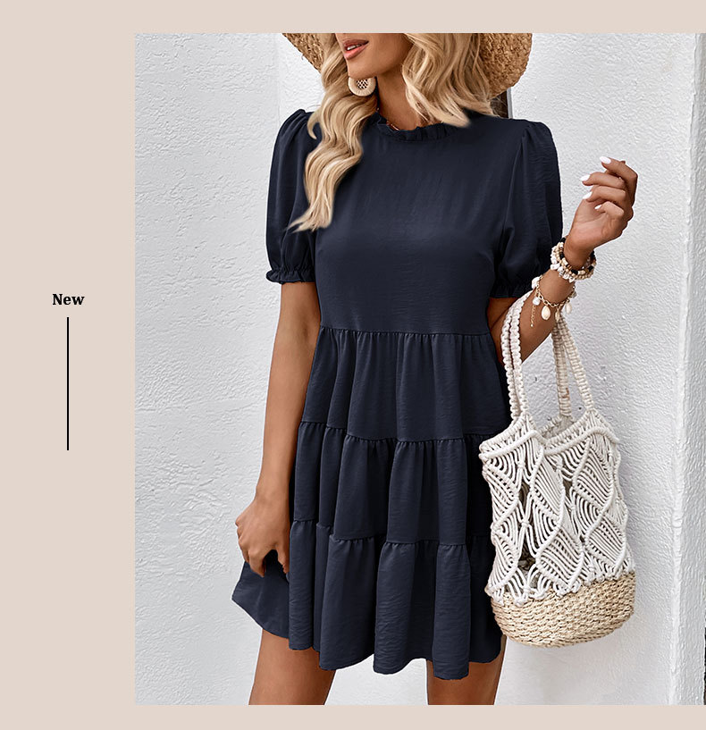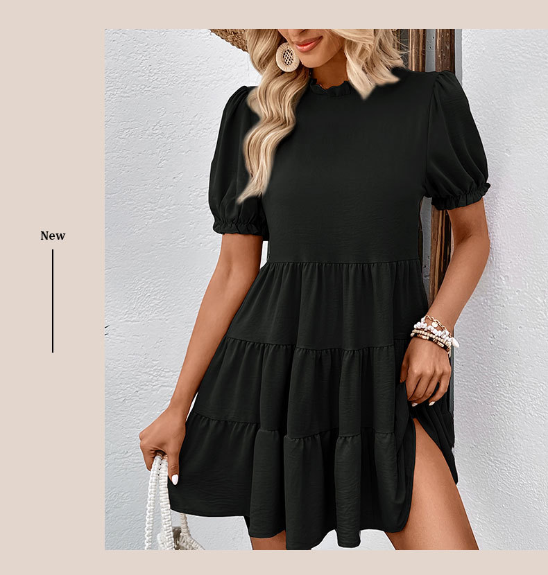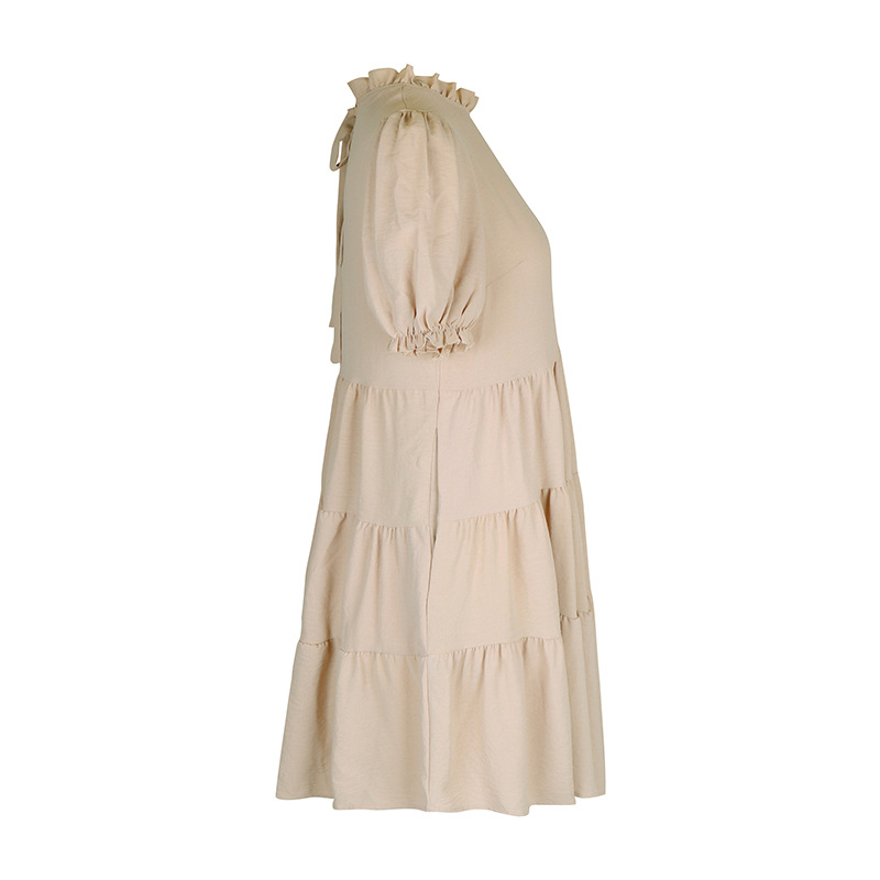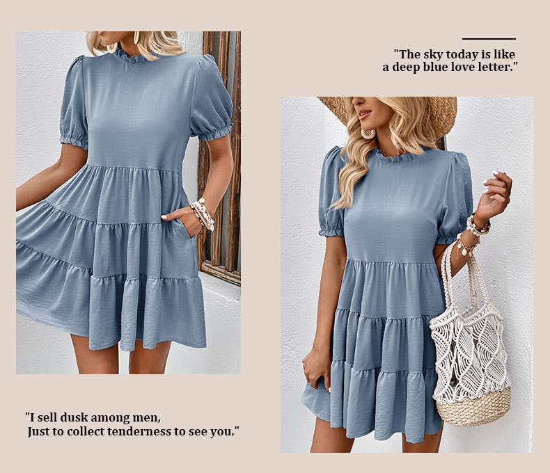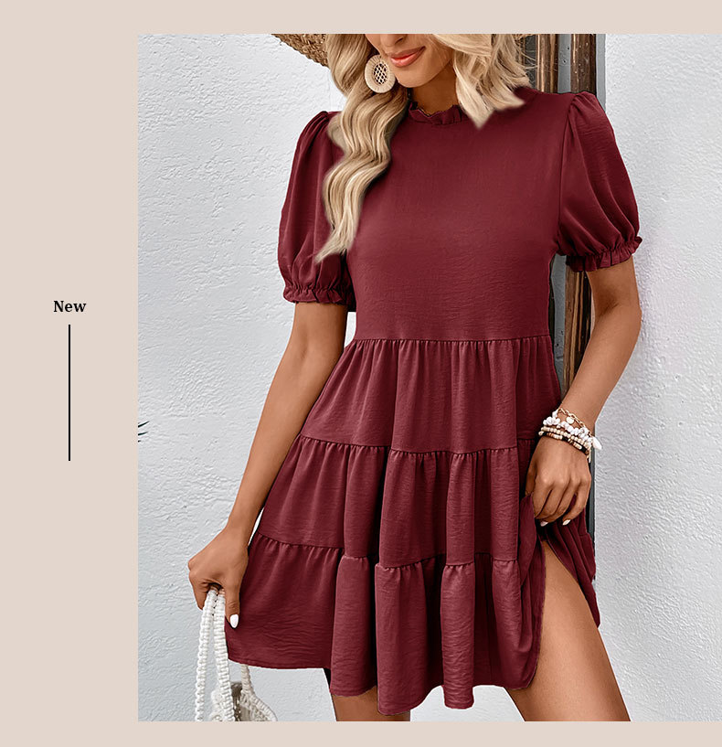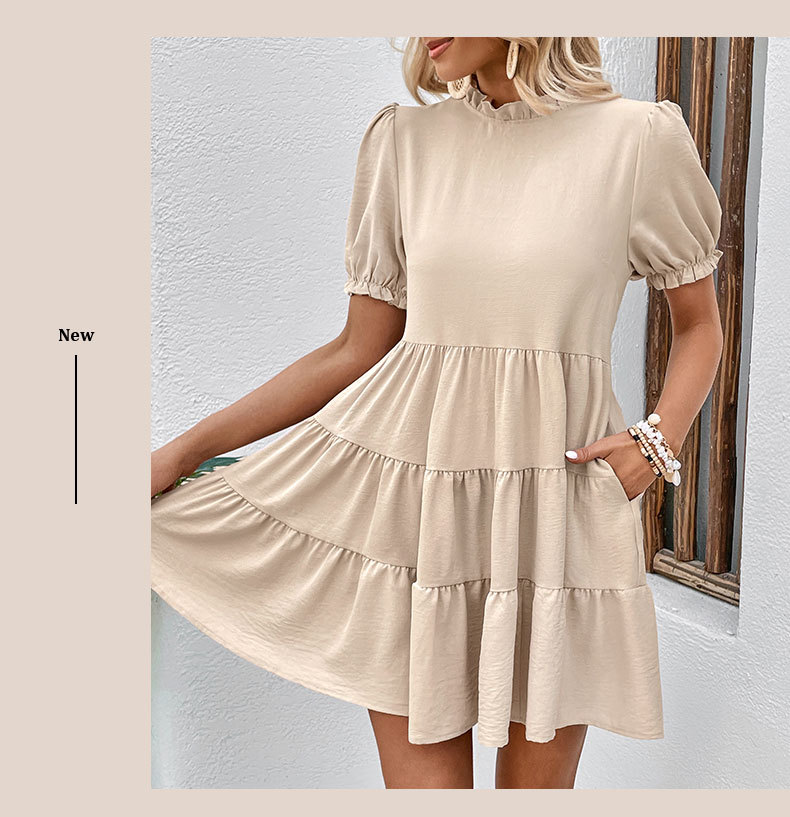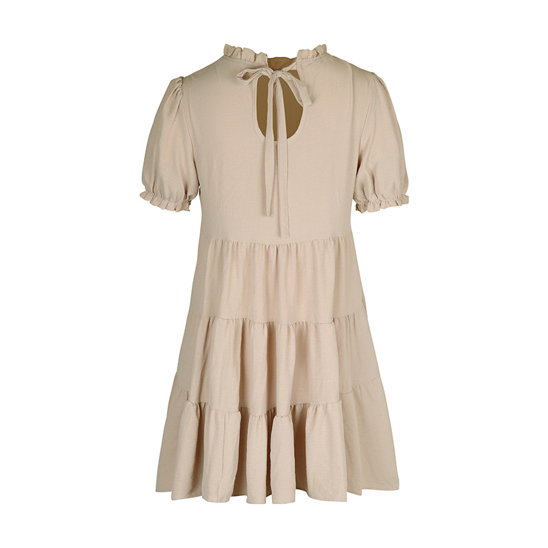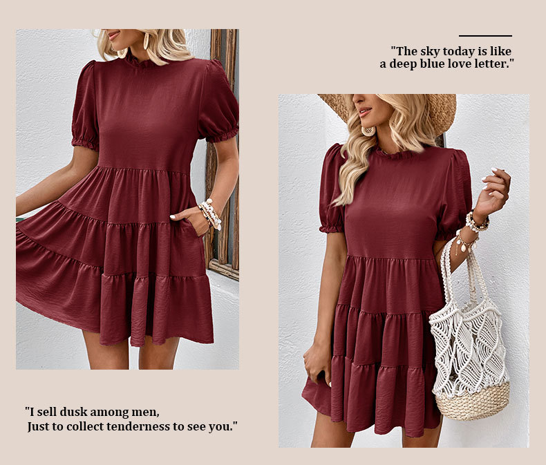 Loose-fitting Round-neck Short-sleeve Pleated Solid-color Dress